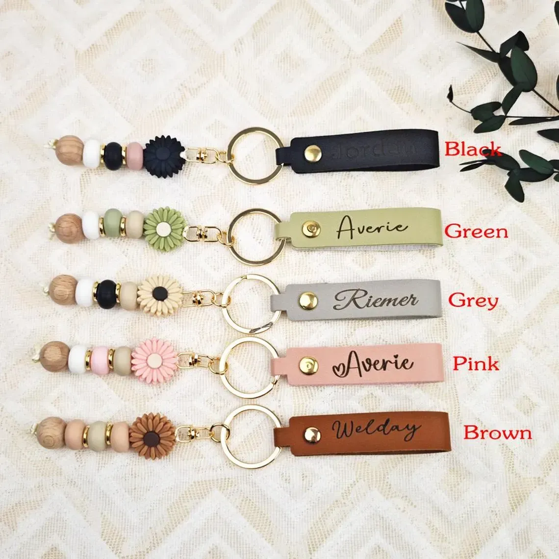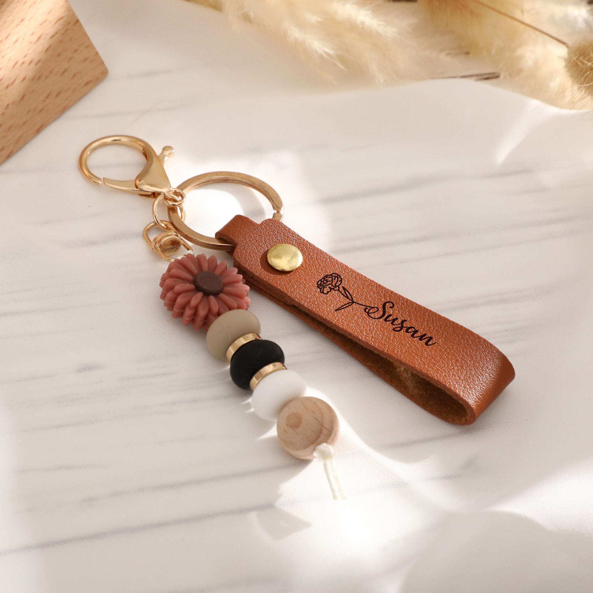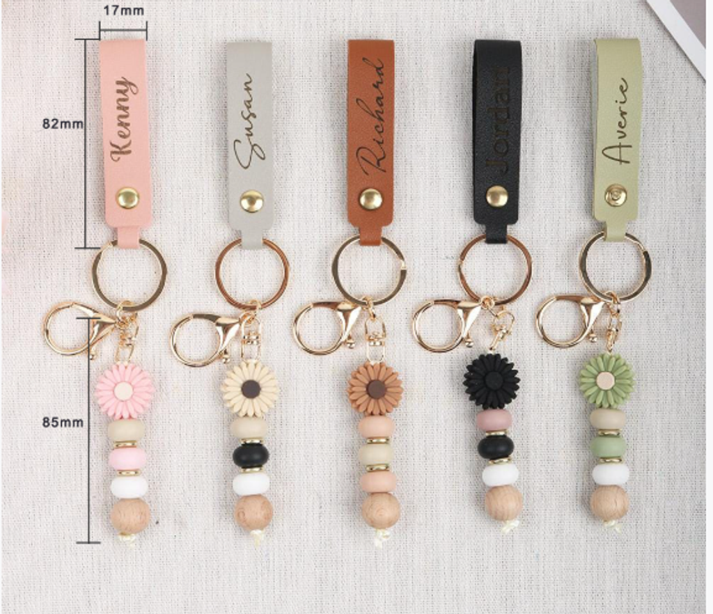 - Nombre: Llavero personalizado de cuero de imitación con cuentas de Margarita